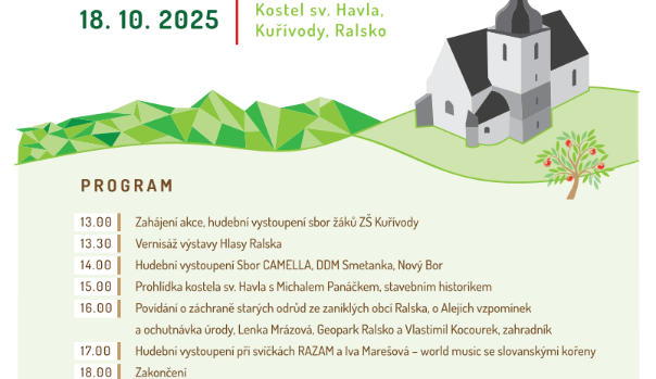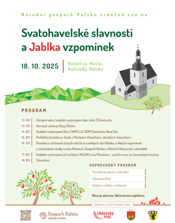 Národní geopark Ralsko zakončí turistickou sezónu roku 2025 novou kulturní akcí – Svatohavelskými slavnostmi a Jablky vzpomínek, které se uskuteční v sobotu 18. října v kostele sv. Havla v Kuřívodech. První ročník svatohavelských slavností připomene jedinečnou památku – poslední dochovaný kostel v bývalém vojenském prostoru Ralsko, místo s mimořádnou atmosférou a výjimečnou výmalbou.