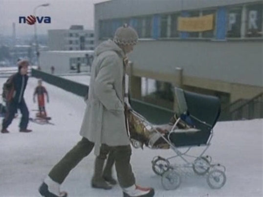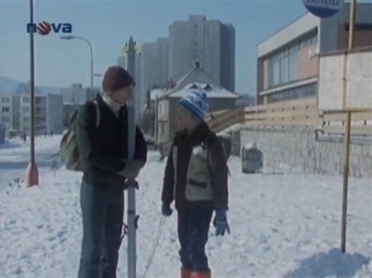 Trochu oříšek. Karfík čeká na autobus a potká svého žáka Jokla. Jenže tady žádná zastávka ve skutečnosti není, také tu vyrostlo už pár stromů. Jsme v Jabloňové ulici.