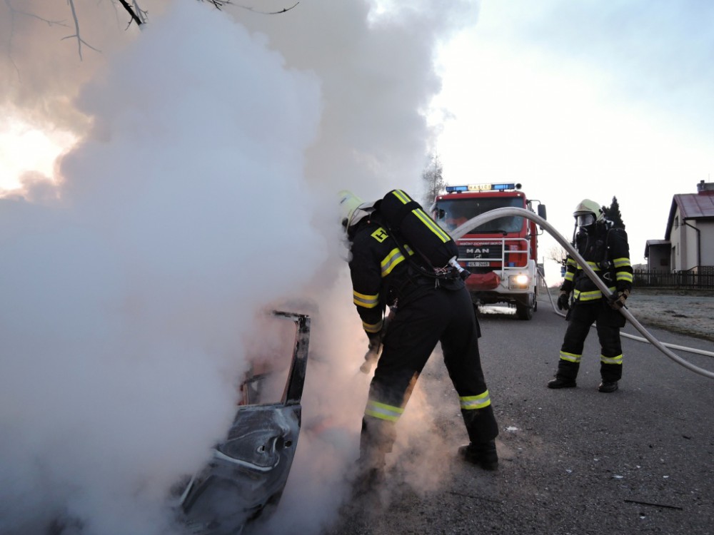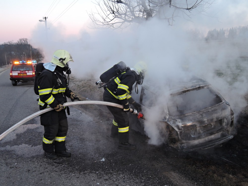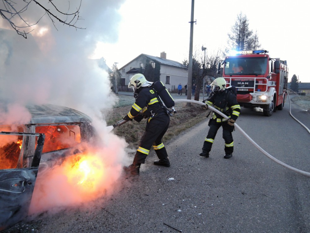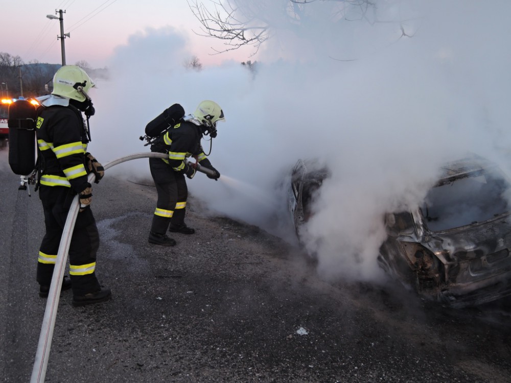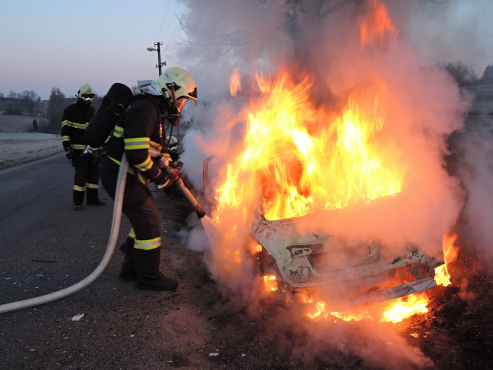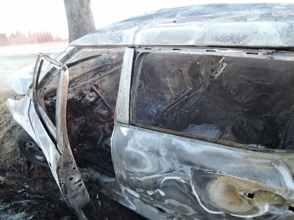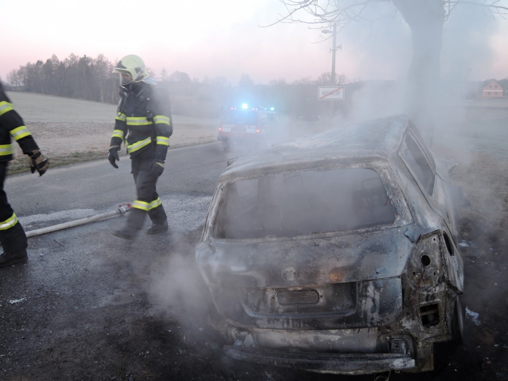 Hořící auto po nárazu do stromu