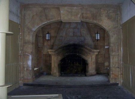 Bizarní papundeklový krb, pozůstatek natáčení televizního seriálu Krev zmizelého.
