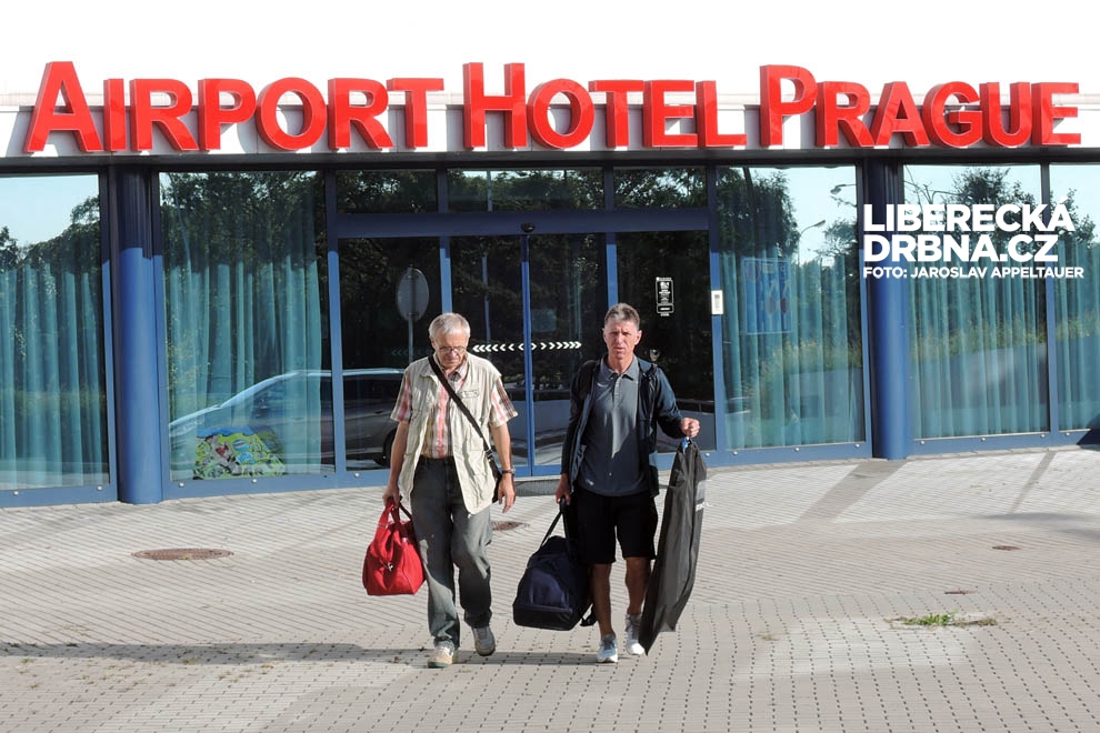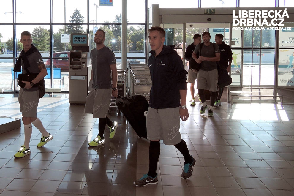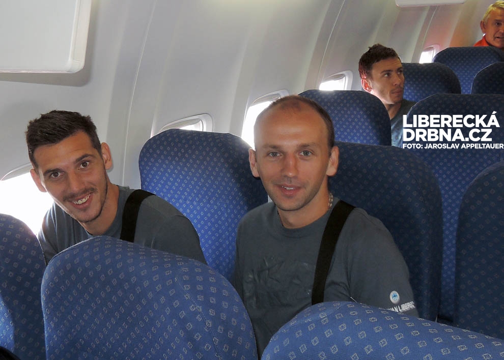 Jiří Fleišman nastupuje do letadla pod dohledem kondičního trenéra Slovanu