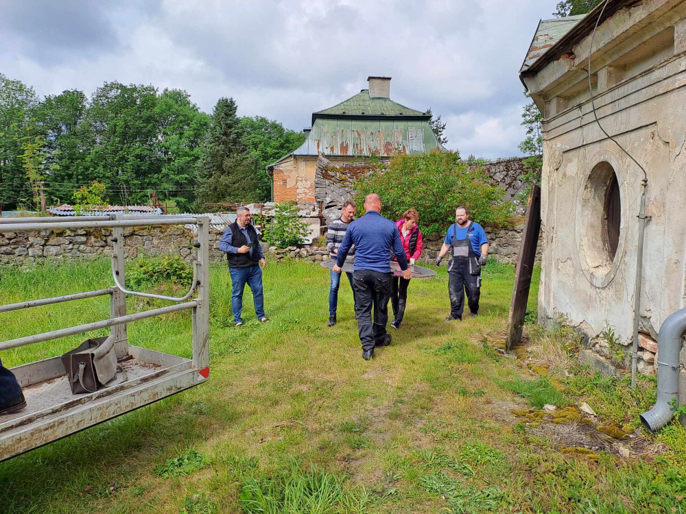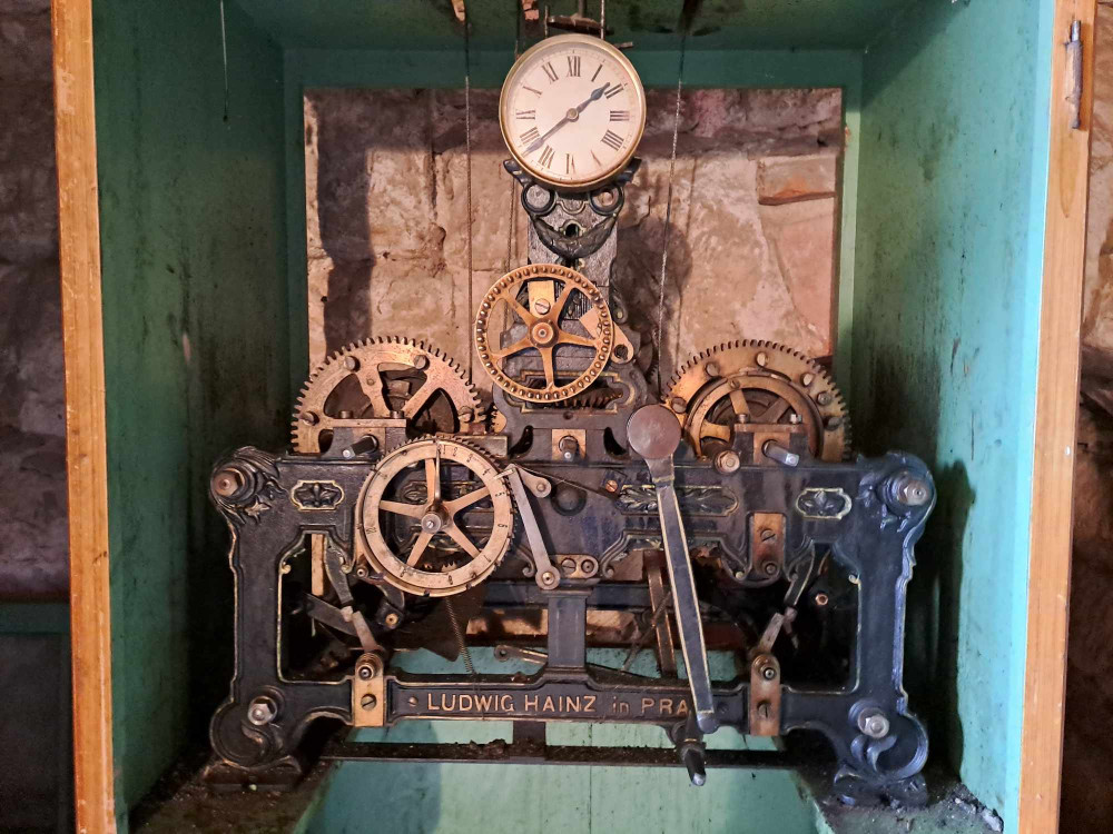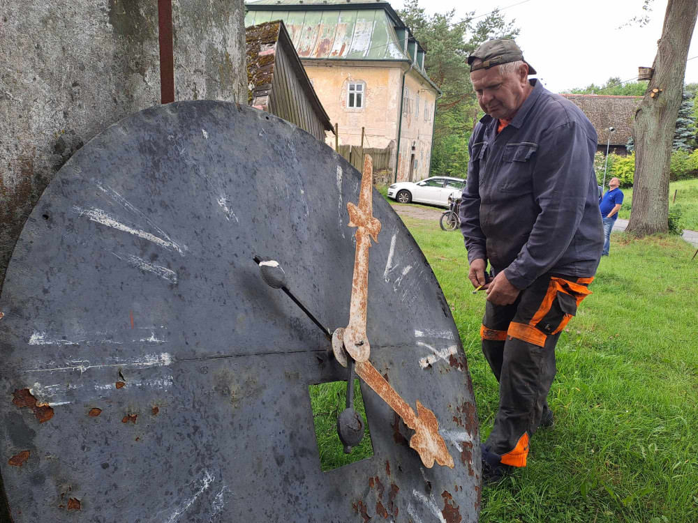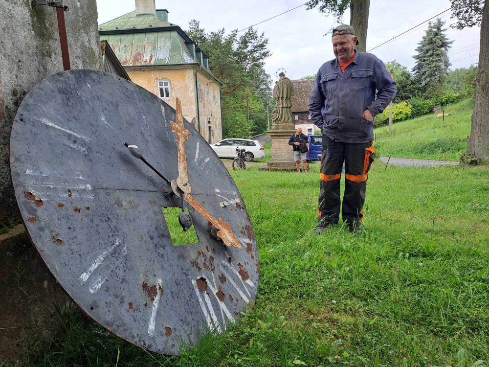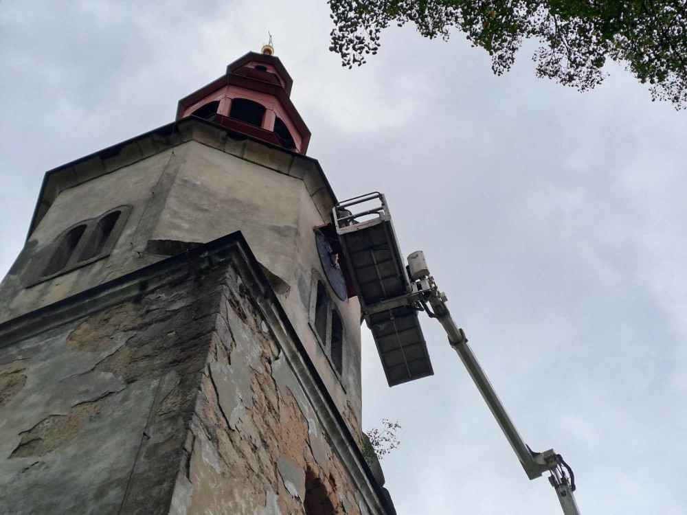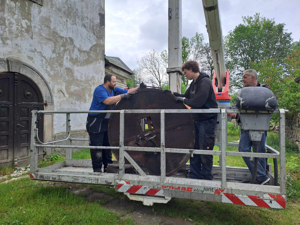 Snášení věžních hodin z kostela sv. Maxmilána v Křižanech