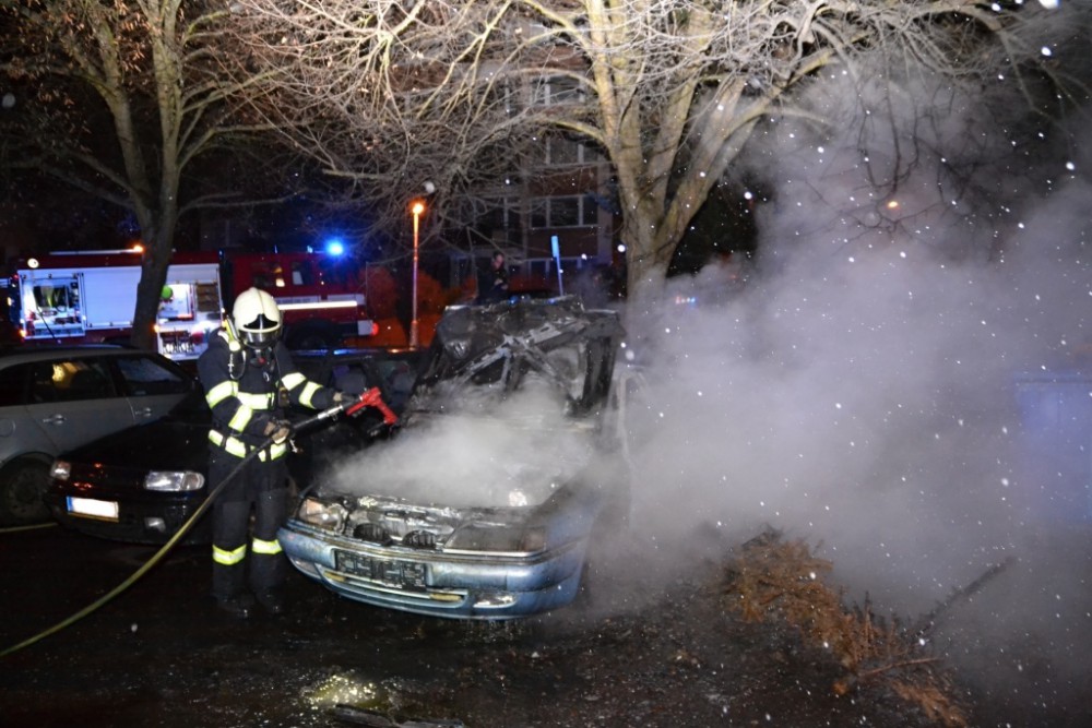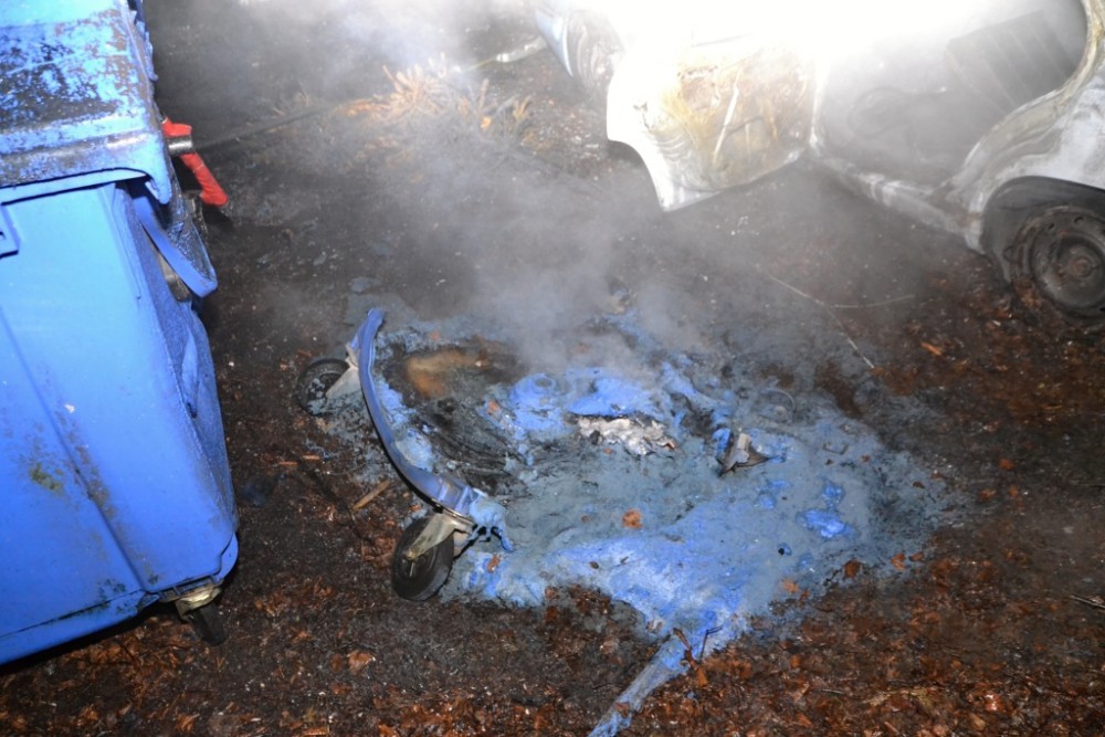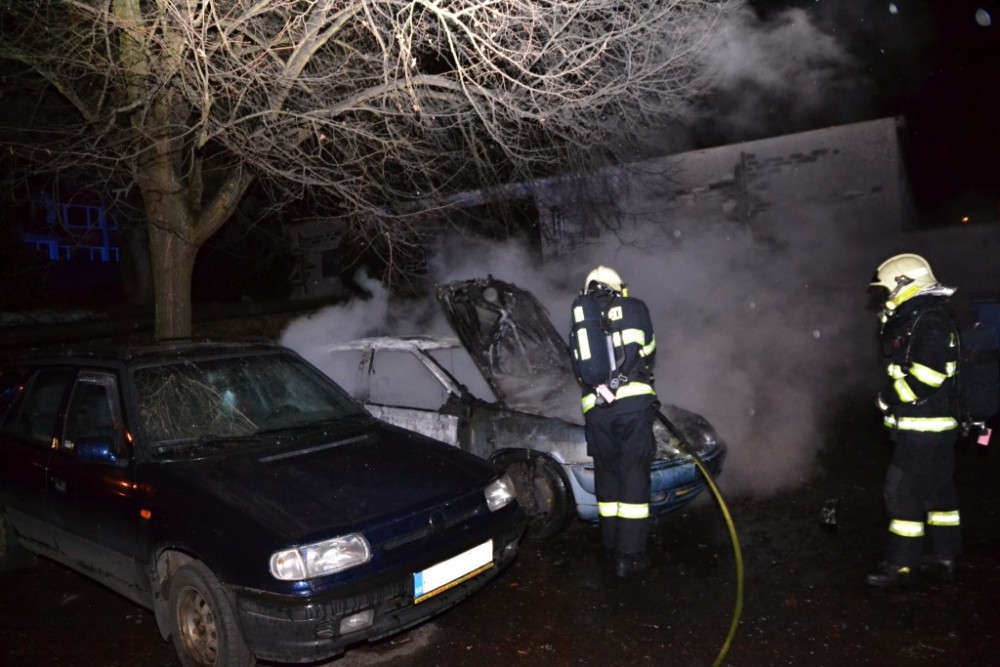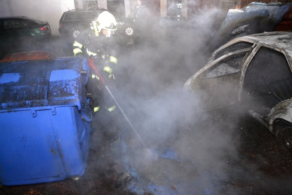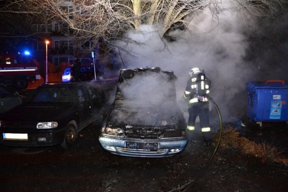FOTO: V Rochlici hořelo zaparkované auto, požár poškodil i další vůz a kontejnery