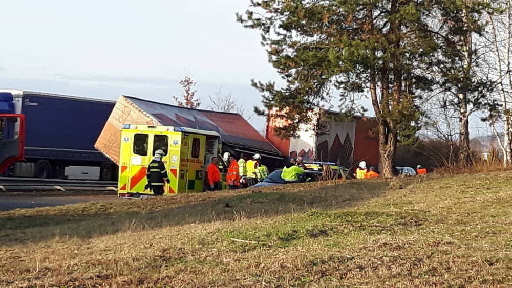 Hlavní tah na Turnov uzavřela nehoda. Návěs nákladního automobilu se převrátil na svodidla