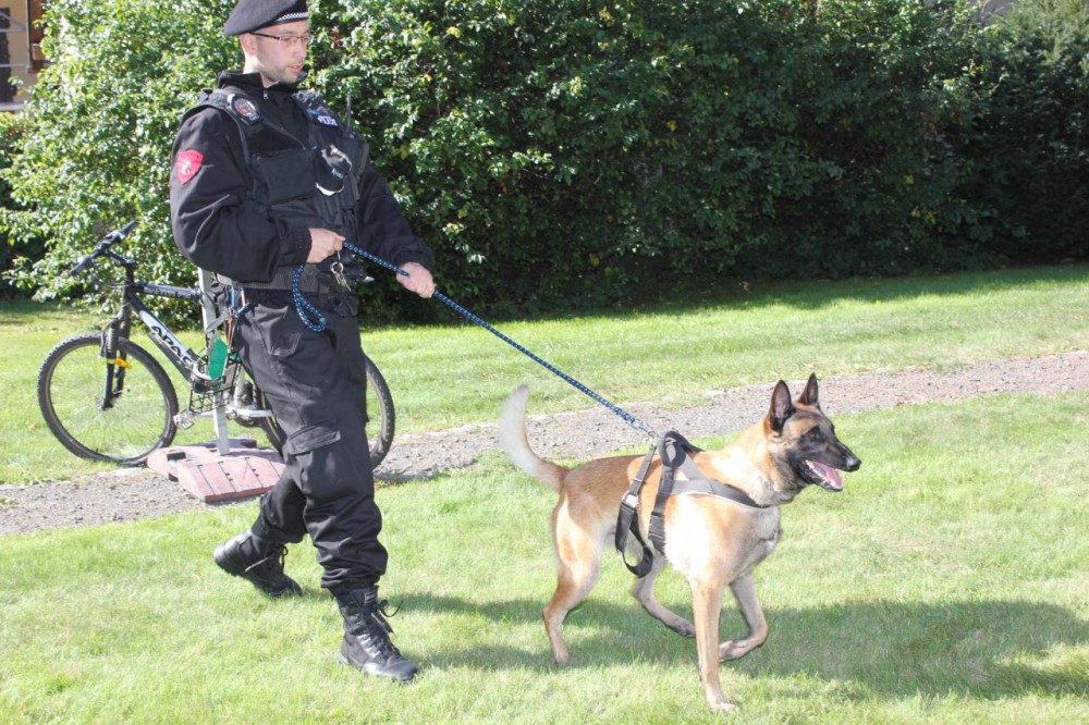 Služební pes se při zásahu zranil a utekl. Na sobě má stále postroj s nápisem Městská policie
