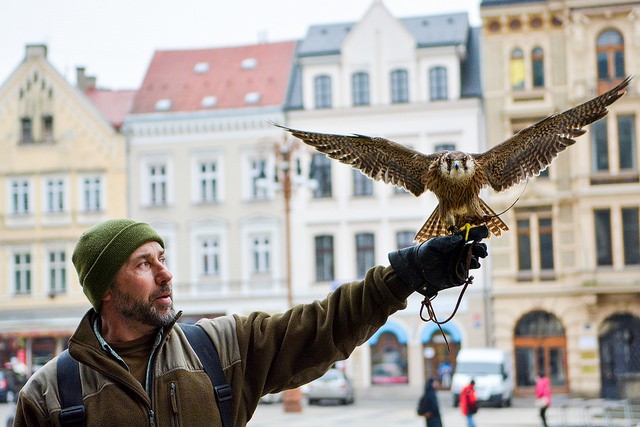 Alexandr Vrága se svými dravci ochrání město před holuby.