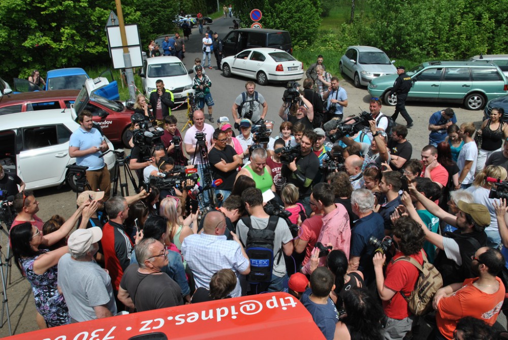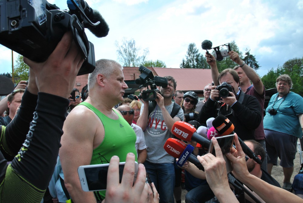 Jiří Kajínek v obležení novinářů a fanoušků.