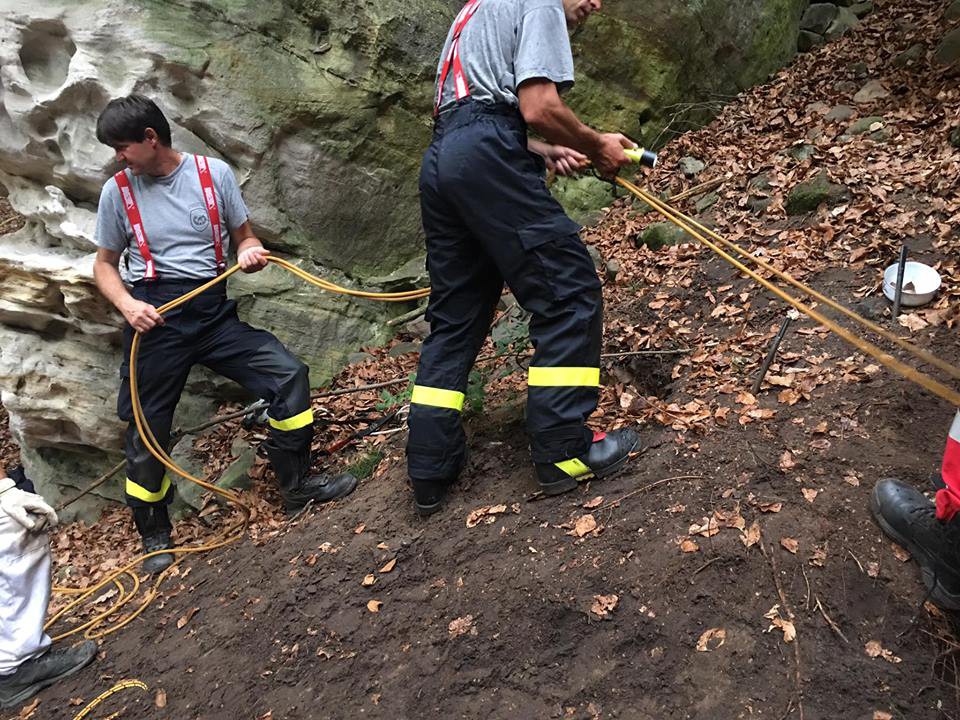 Na místě už sedmý den různé týmy záchranářů bojují o život psa a lišky.
