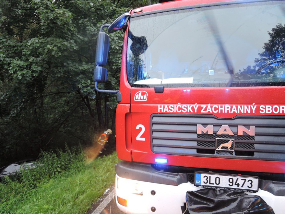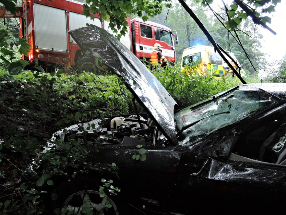 FOTO: Řidič bavoráku na mokru nezvládl zatáčky mezi Libercem a Jabloncem a sjel ze silnice