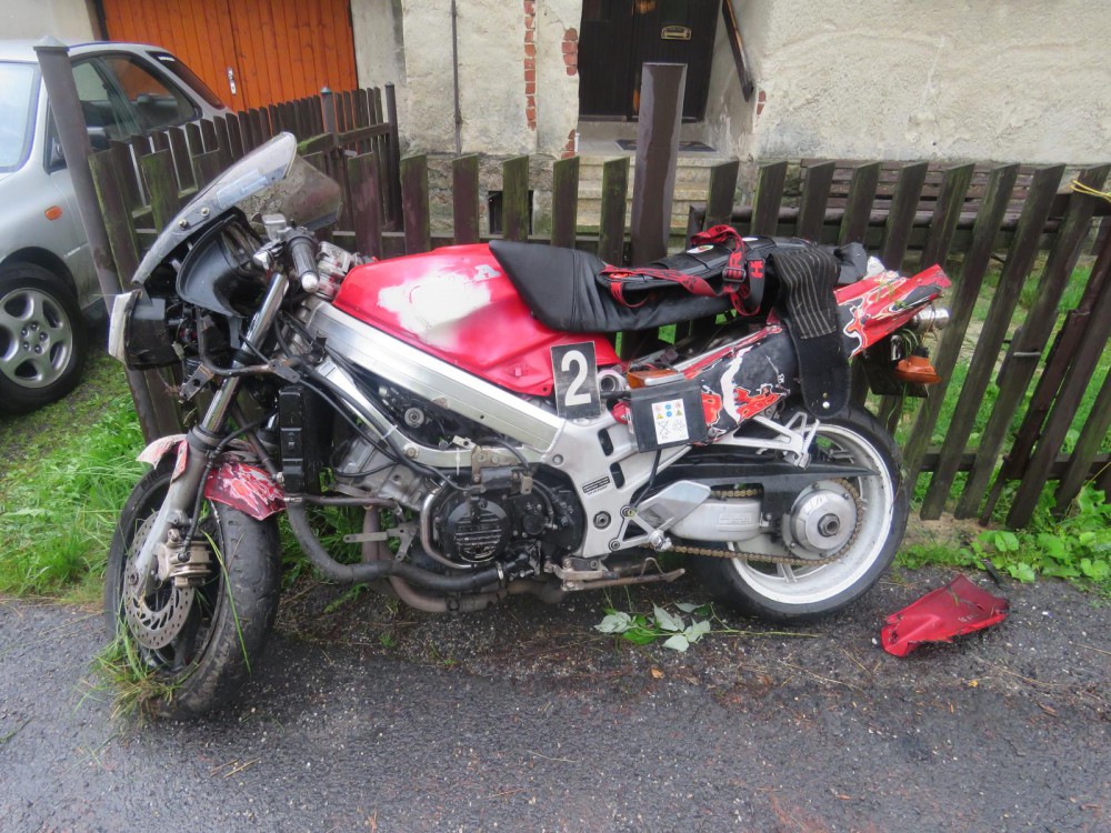 Motocyklista nezvládl svůj stroj na mokré silnici, havaroval a těžce se zranil.