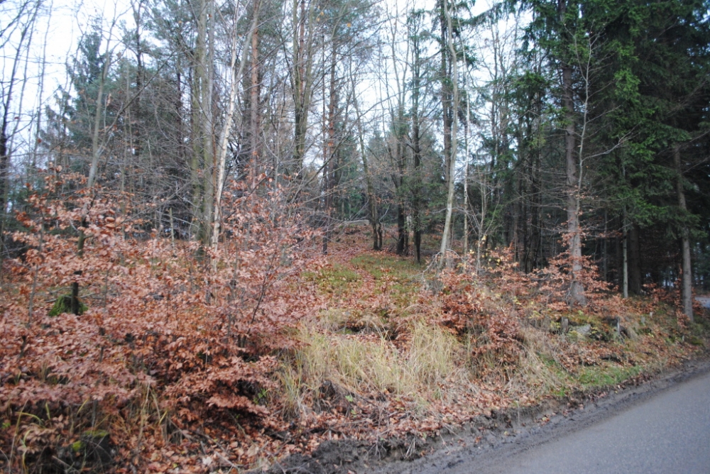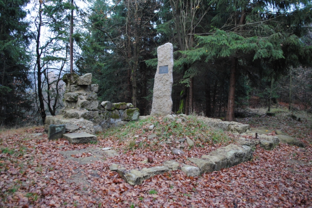 Ze silnice vede k výšině nenápadná pěšina. Teď na podzim, ale je vidět obelisk