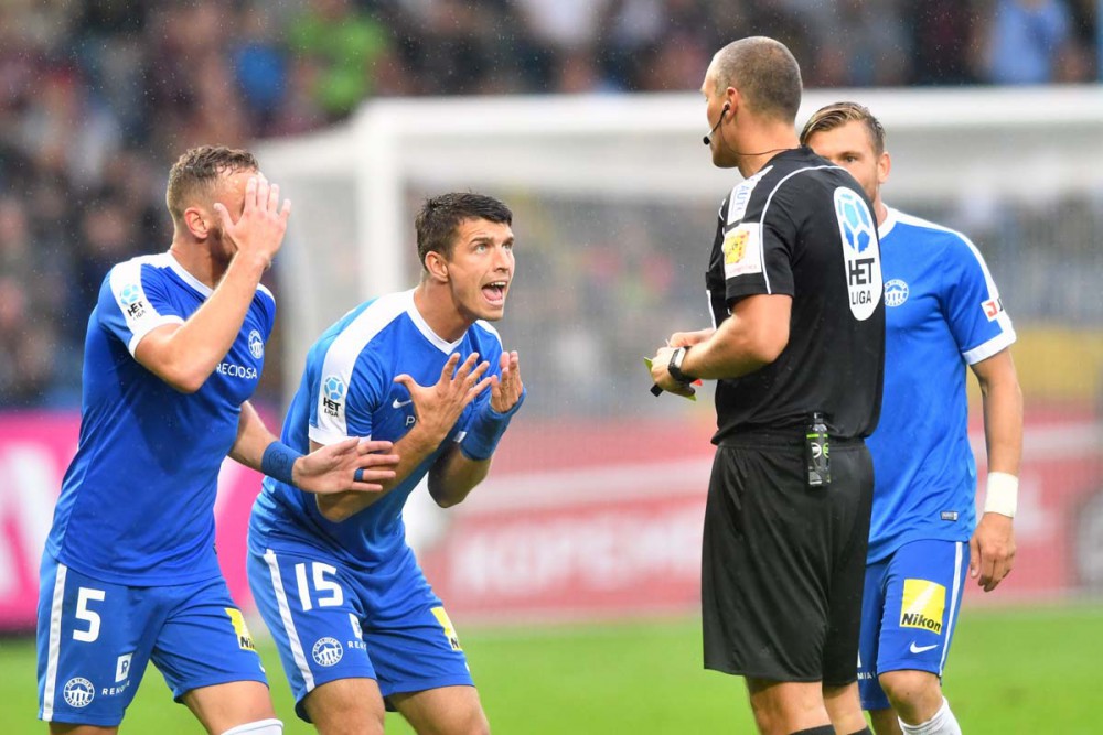Co to pískáš, to nebyl faul, postěžoval si Kúdela. Rozhodčí Zelinka ho za to poslal do sprch.