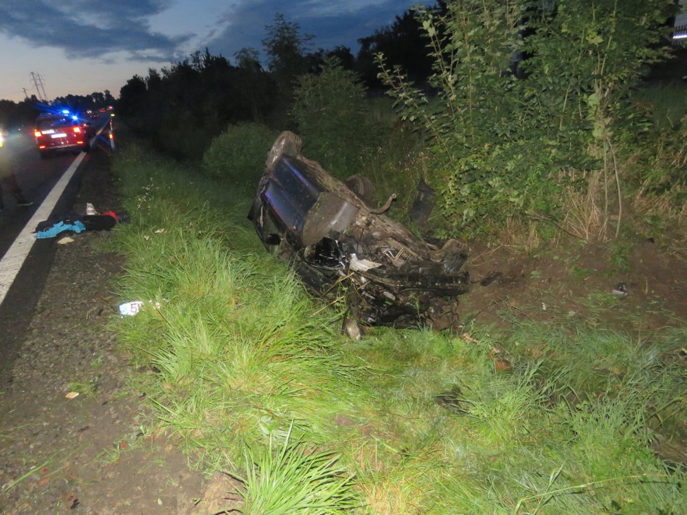 Vrak auta zůstal po nehodě ležet na střeše, posádka se štěstím neutrpěla vážná poranění.