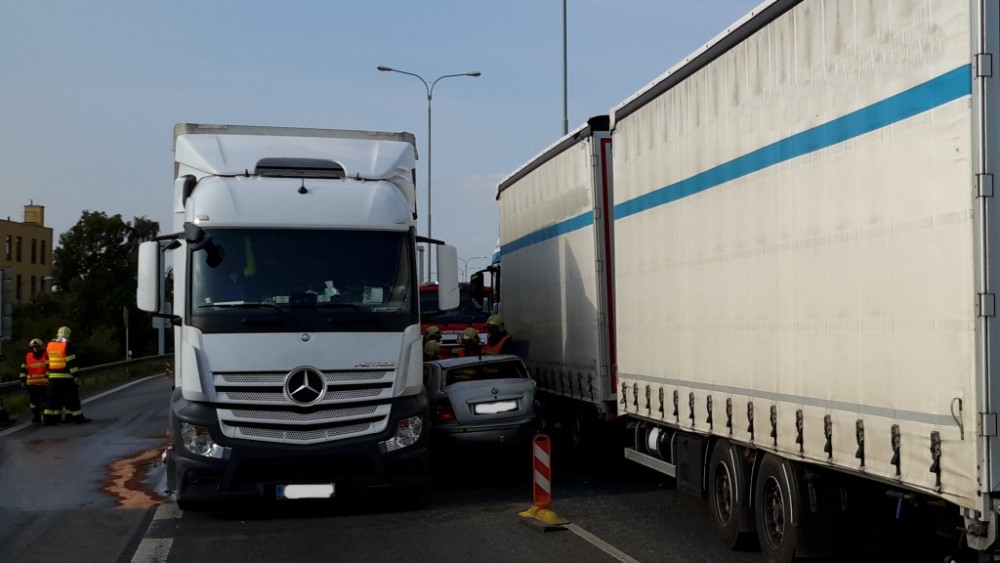 FOTO: Dva kamiony vzaly mezi sebe auto. Průtah Libercem zkolaboval