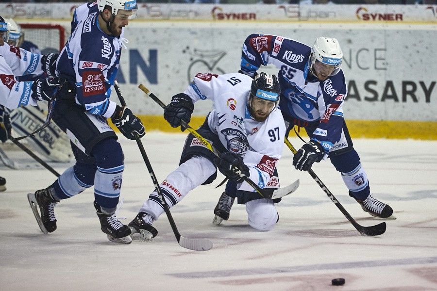 Na kolenou. Liberecký Vantuch v obležení soupeřů.