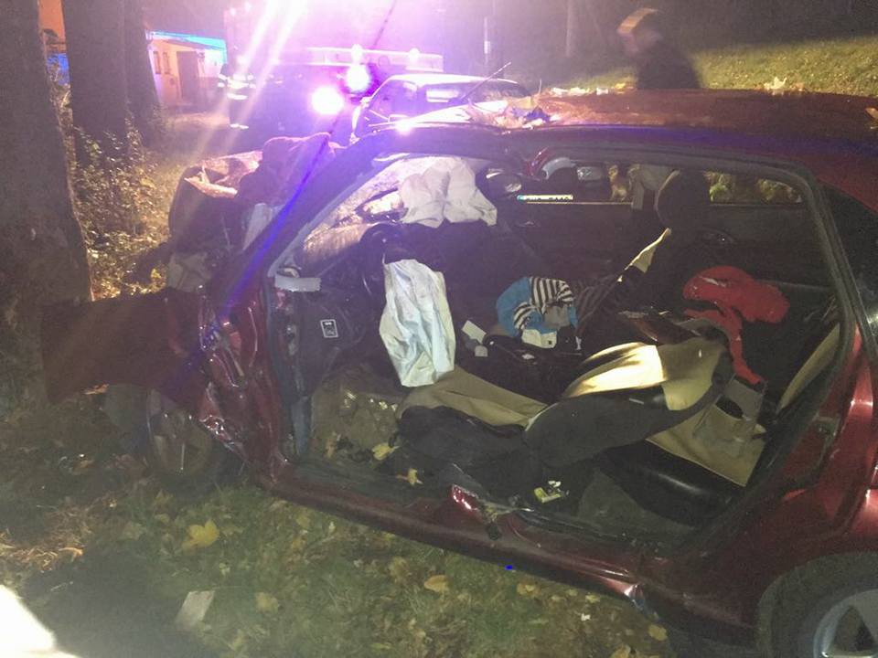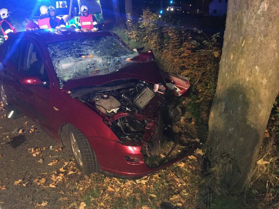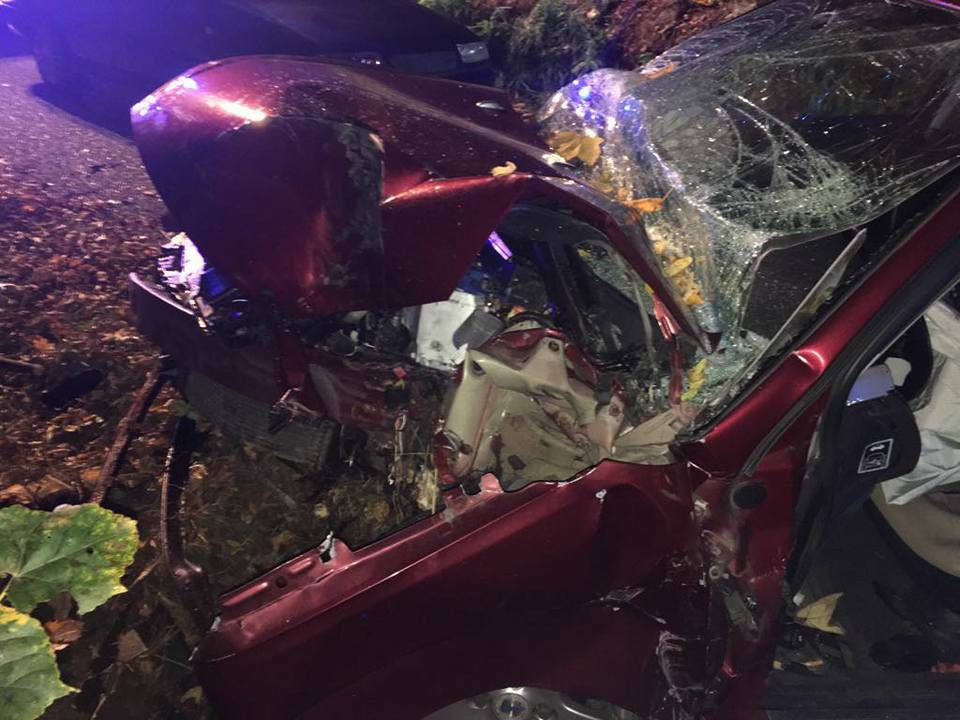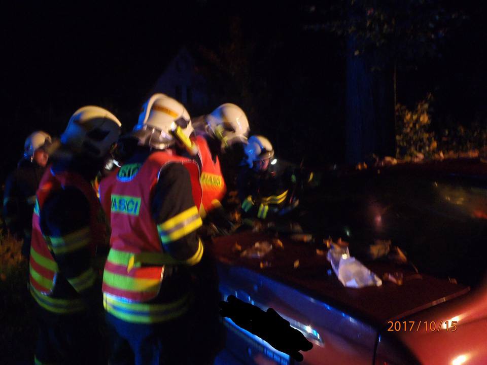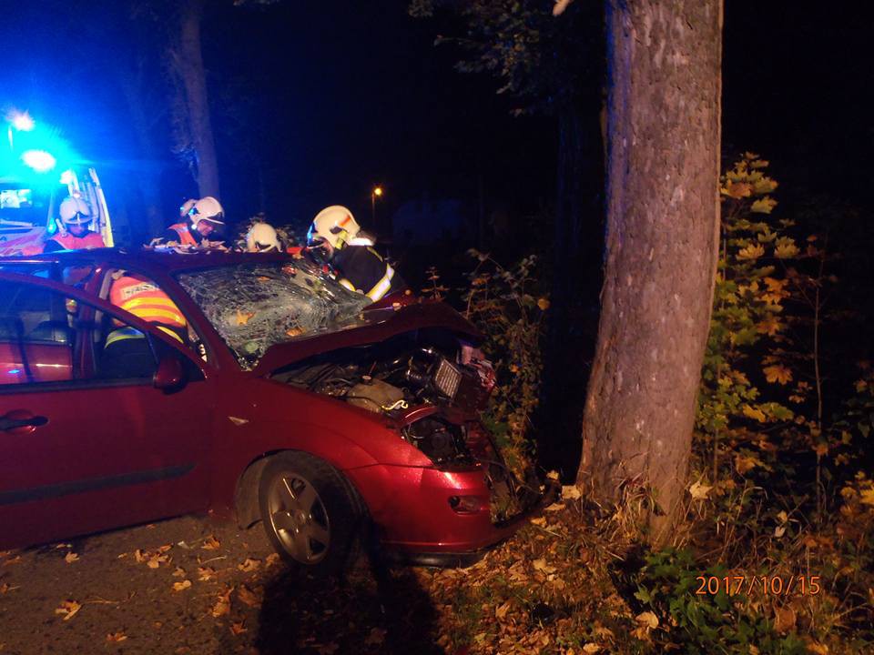 FOTO: Řidič trefil strom a v autě zůstal zaklíněný. Sám si zavolal pomoc