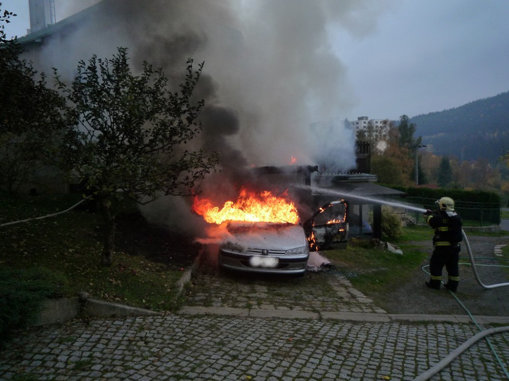 FOTO: Hasiče zaměstnalo hořící auto. Oheň zasáhl i přístavek domu