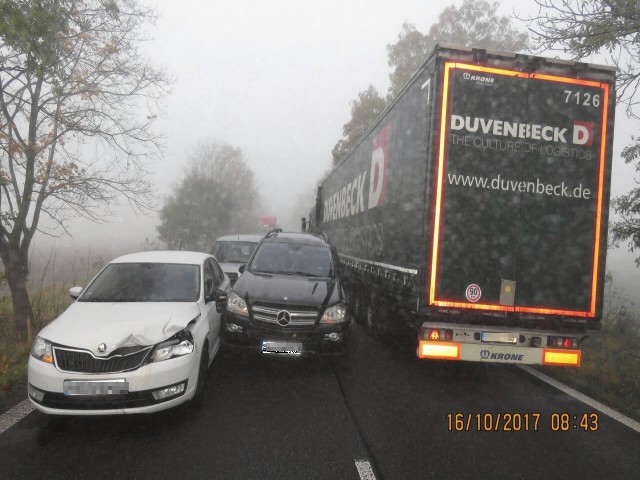 Předjíždění v silné mlze se řidiči Mercedesu vymstilo. Své auto zaklínil mezi kamion a další osobák
