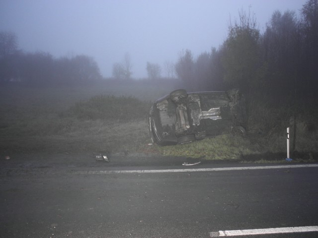 Předjíždění v silné mlze skončilo těžkým poraněním motocyklisty. Srazila ho protijedoucí Octavie.