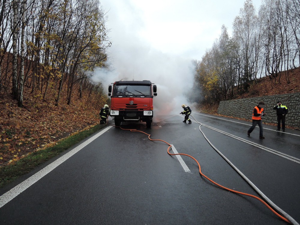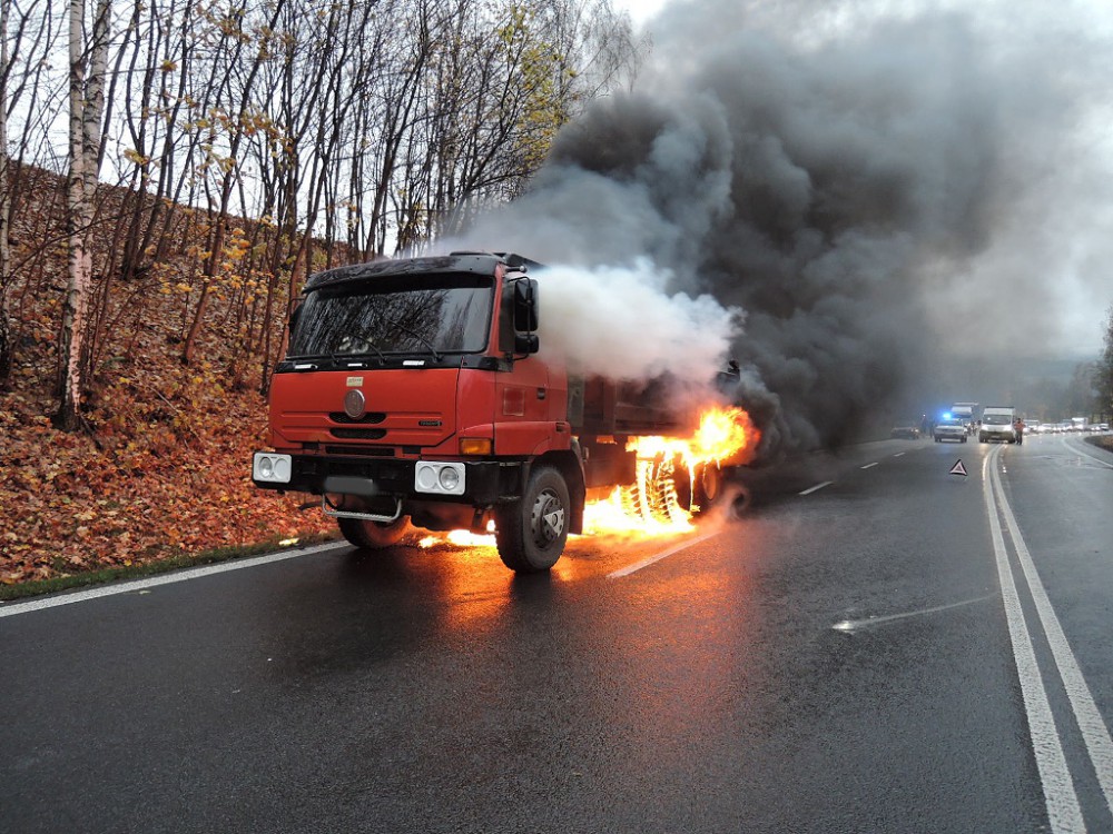 FOTO: Tatrovka začala za jízdy hořet. Řidič stihl včas utéct