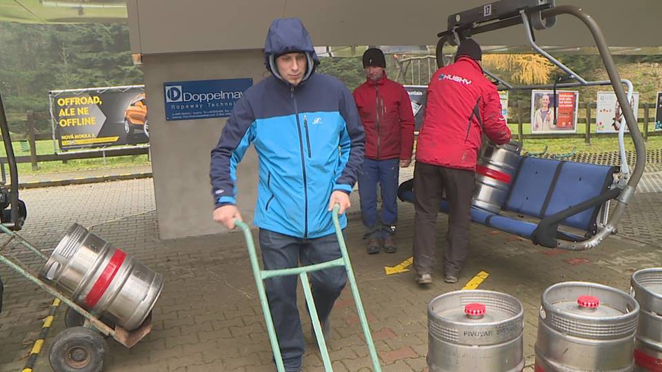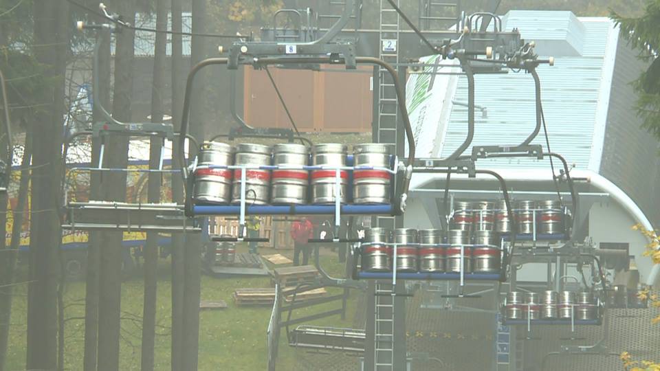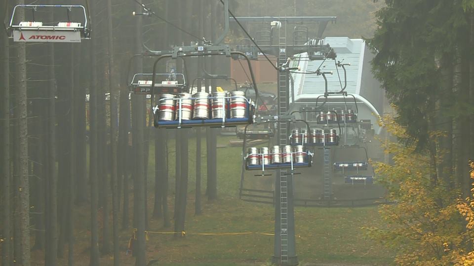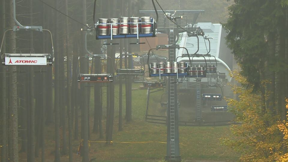 FOTO: Na lanovce kroužily stovky pivních sudů. Technici testovali před zimní sezonou funkčnost brzd