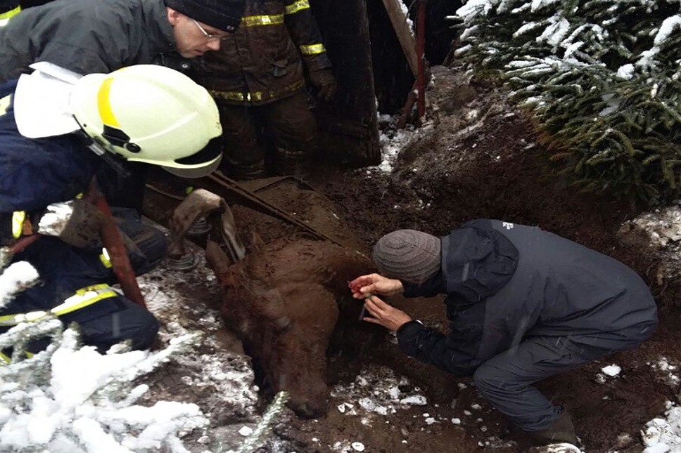 Hasiči se snažili zachránit koně zapadlého do bahna.
