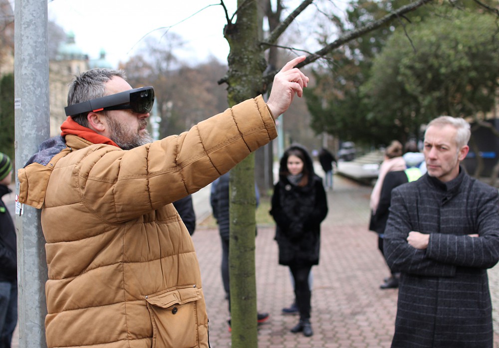 Richard Charvát s HoloLens na místě budoucí zastávky. Sleduje ho Jan Stolín