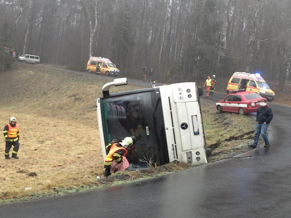 Autobus se v "esíčku" převrátil na bok. Foto: HZSLK