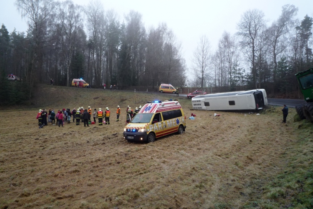 Autobus se v "esíčku" převrátil na bok. Foto: HZSLK
