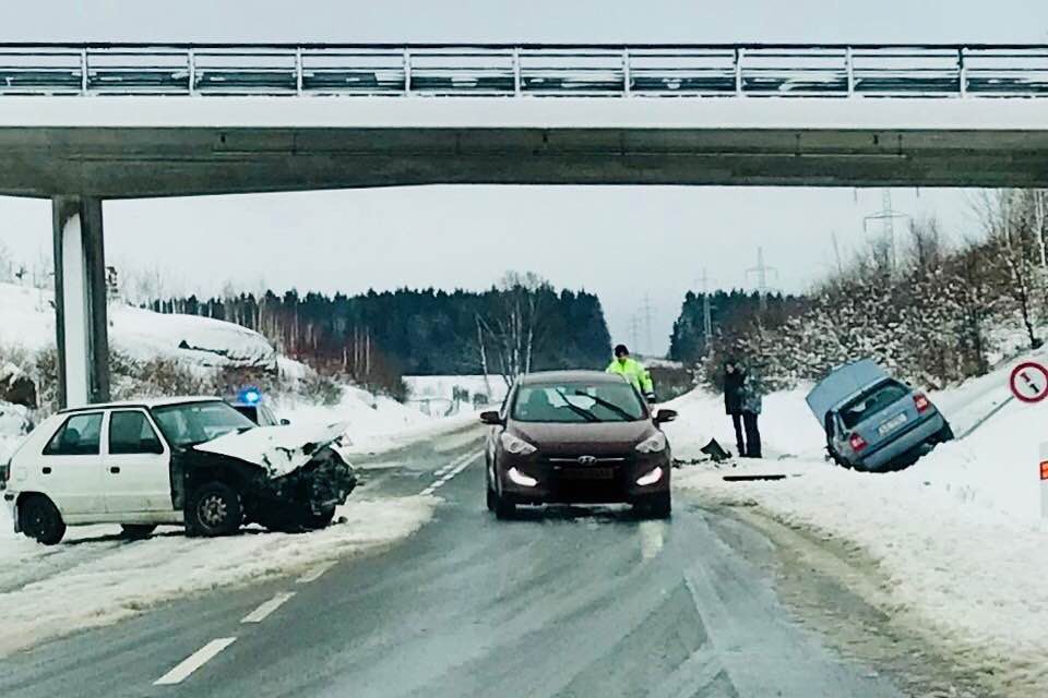 Řidička dostala na zasněžené silnici smyk, přejela do protisměru a nabourala do dalšího auta