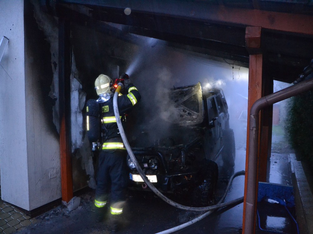 Zkrat autobaterie způsobil milionovou škodu. Auto lehlo popelem, požár poškodil i dům.