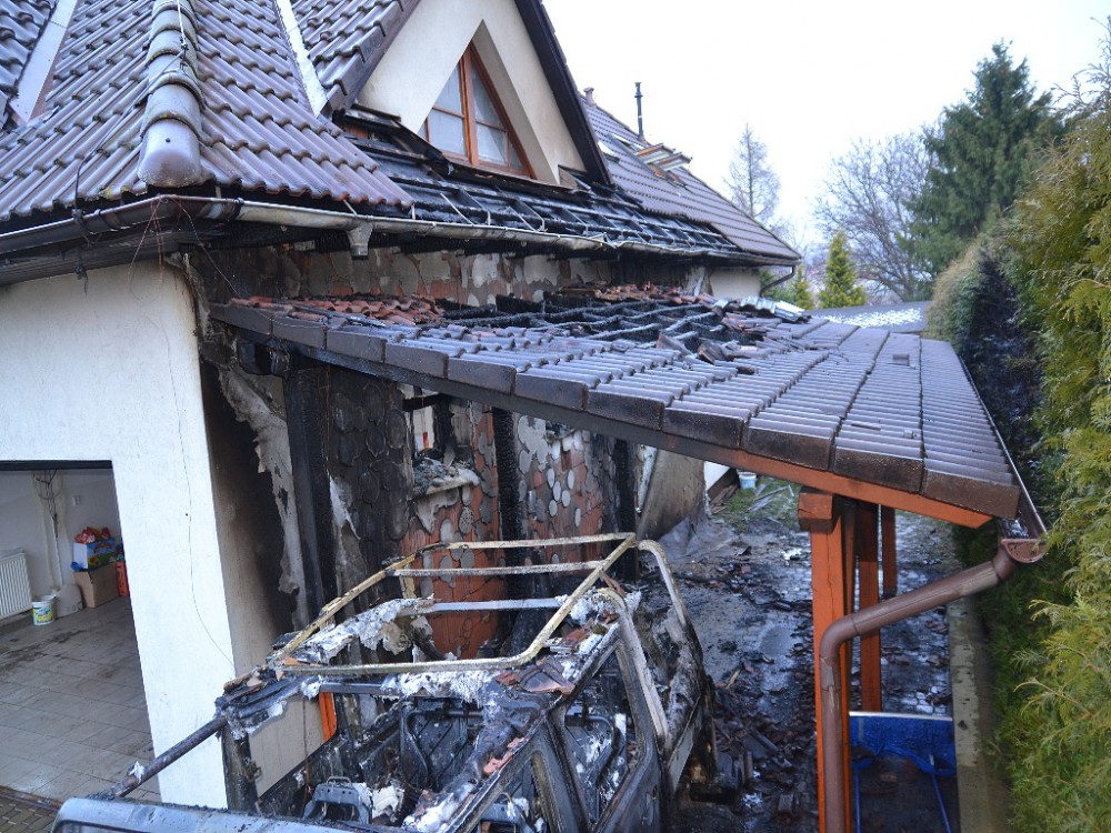 FOTO: Zkrat autobaterie způsobil milionovou škodu. Auto lehlo popelem, požár poškodil i dům