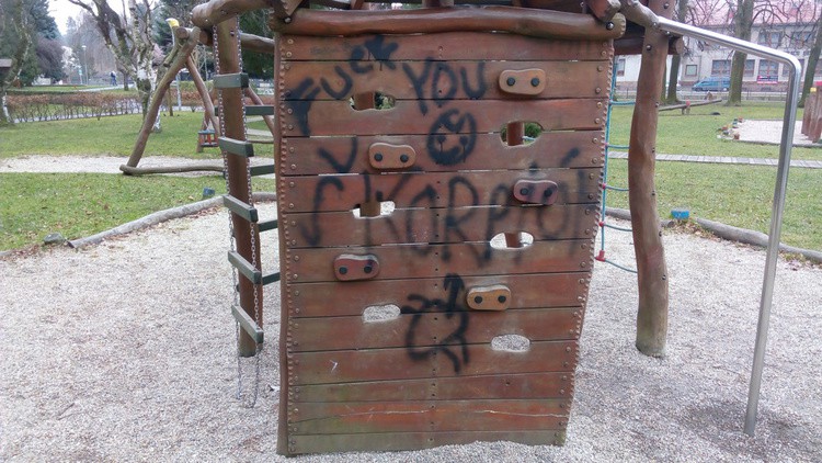 Tři kluci pomalovali prolézačky sprostými nápisy. Kolemjdoucí na ně zavolali strážníky