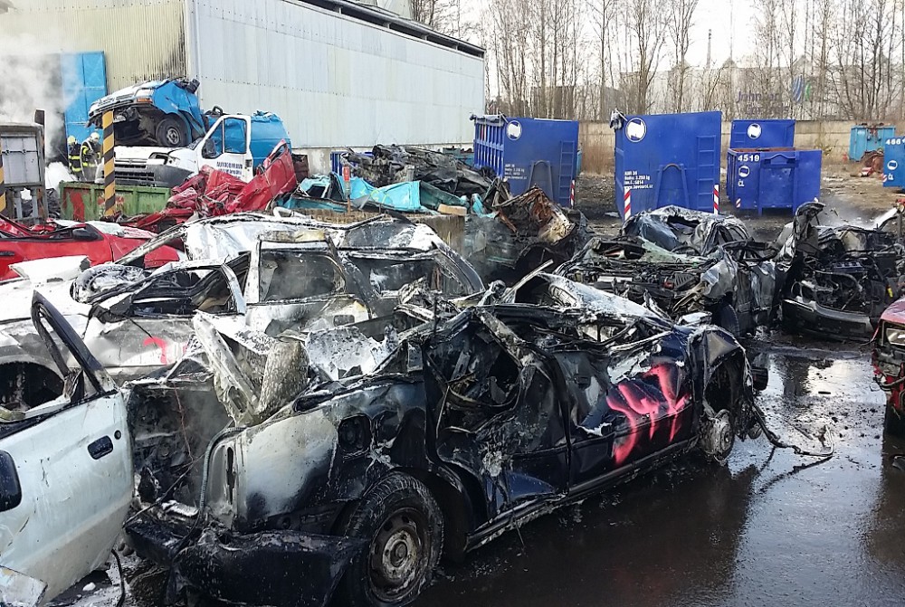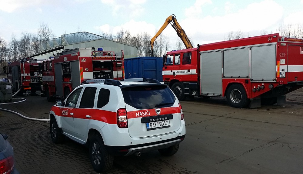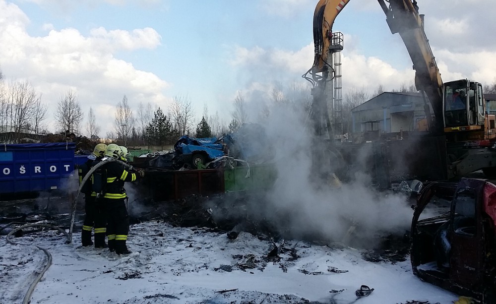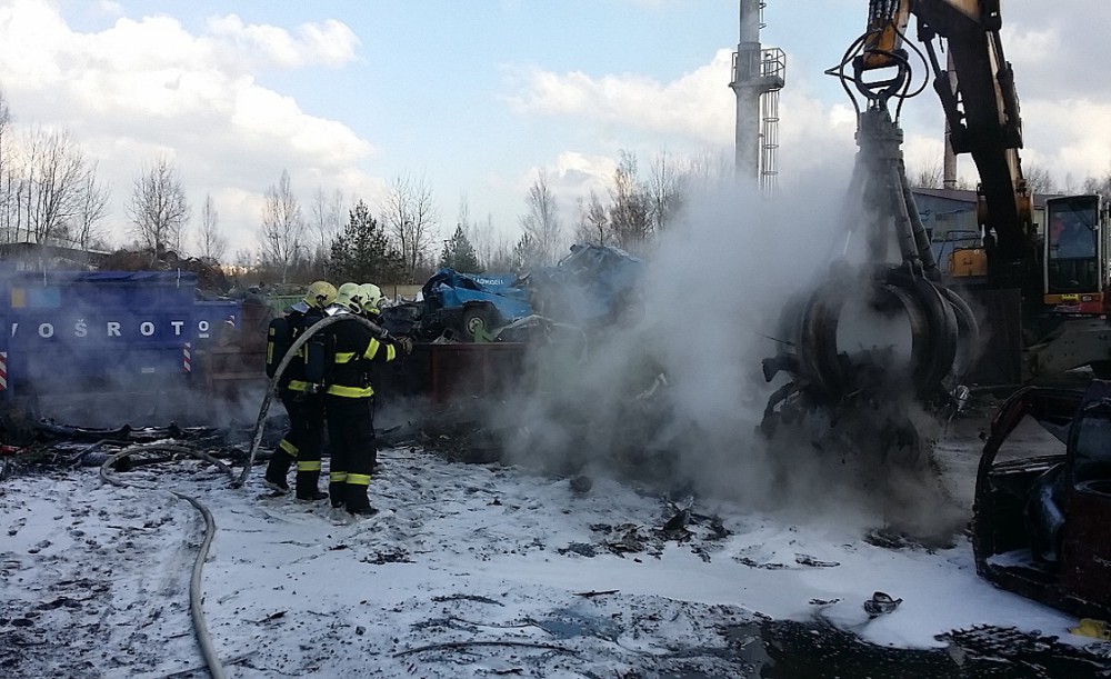 FOTO: V Kovošrotu hořelo čtrnáct aut. S požárem pomáhala i hydraulická ruka