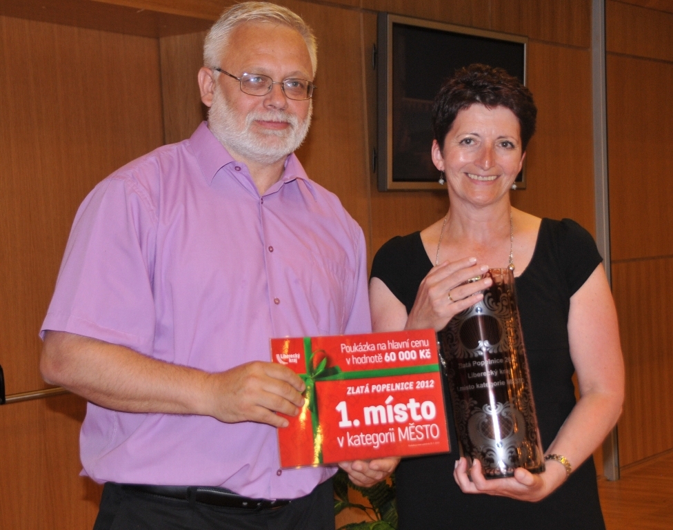 Vítězný Harrachov - náměstek J. Jadrný, starostka E. Zbrojová. Foto: Kraj-lbc.cz