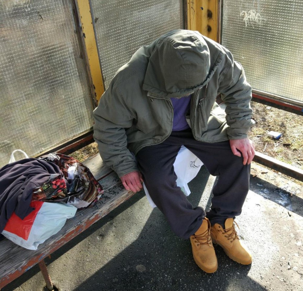 Muž bez domova na zastávce v České Lípě.