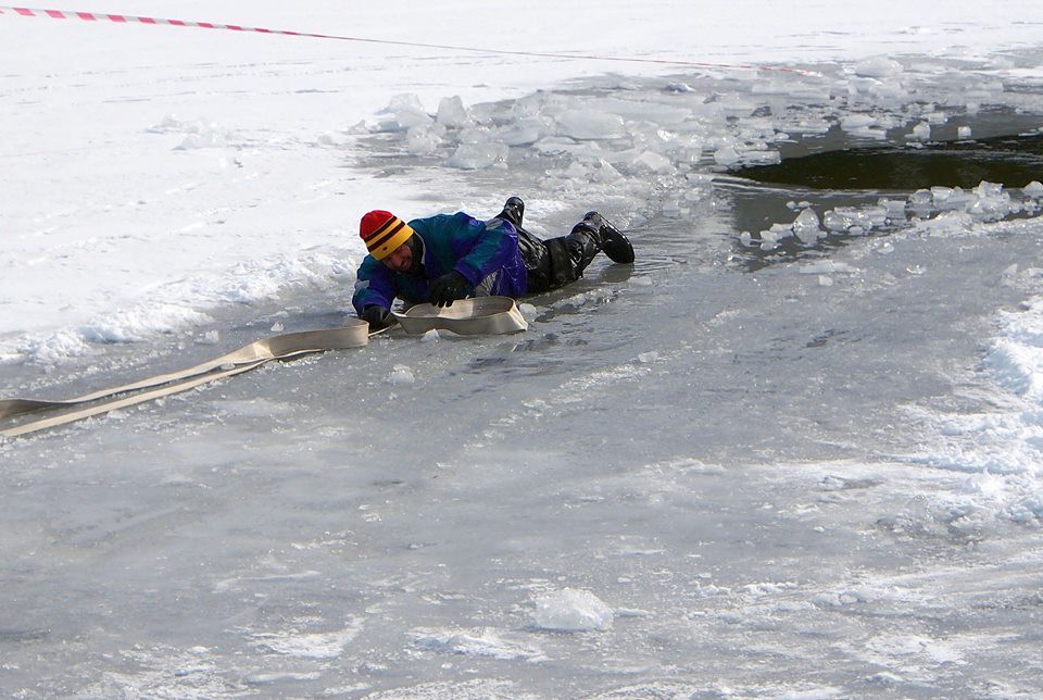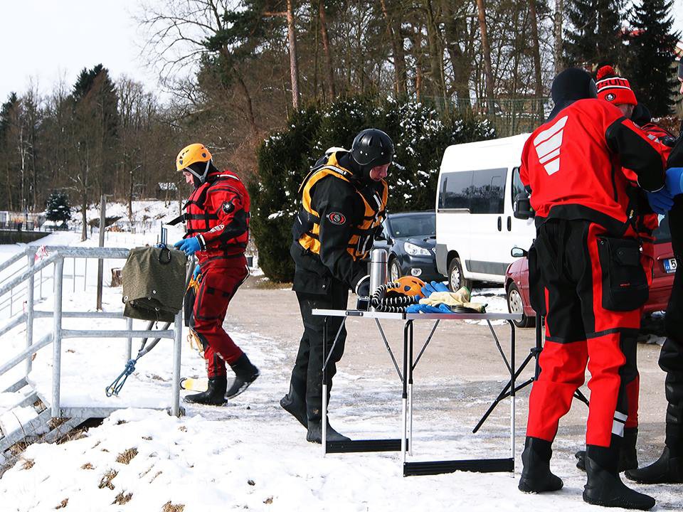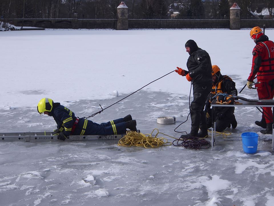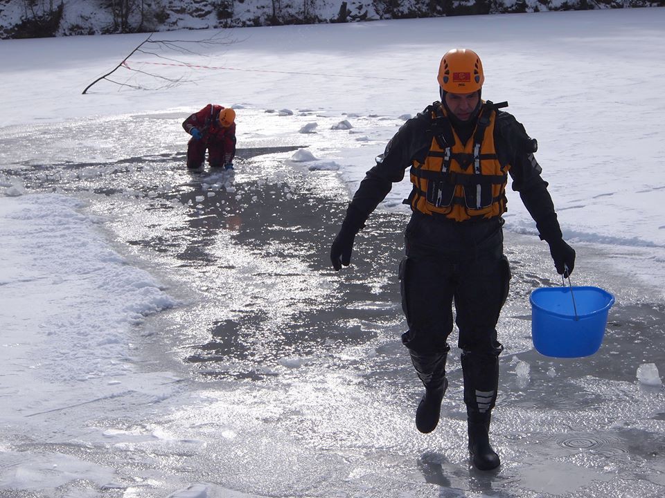 FOTO: Led už není bezpečný, varují záchranáři. Vytahování tonoucího trénovali na přehradě
