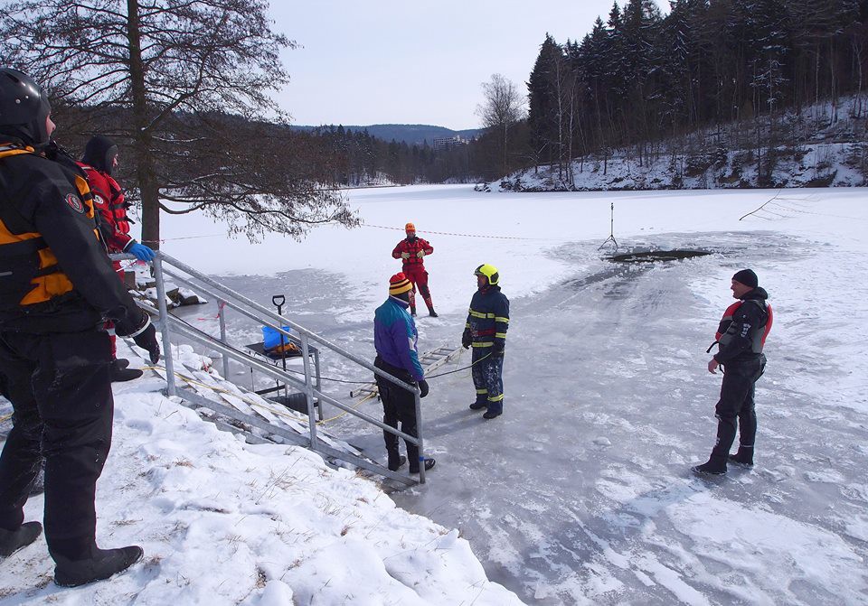 Led už není bezpečný, varují záchranáři. Vytahování tonoucího trénovali na přehradě.