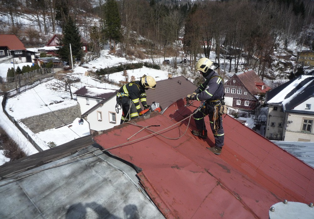 Hasičští lezci zasahovali v Desné u střechy hrozící pádem na silnici