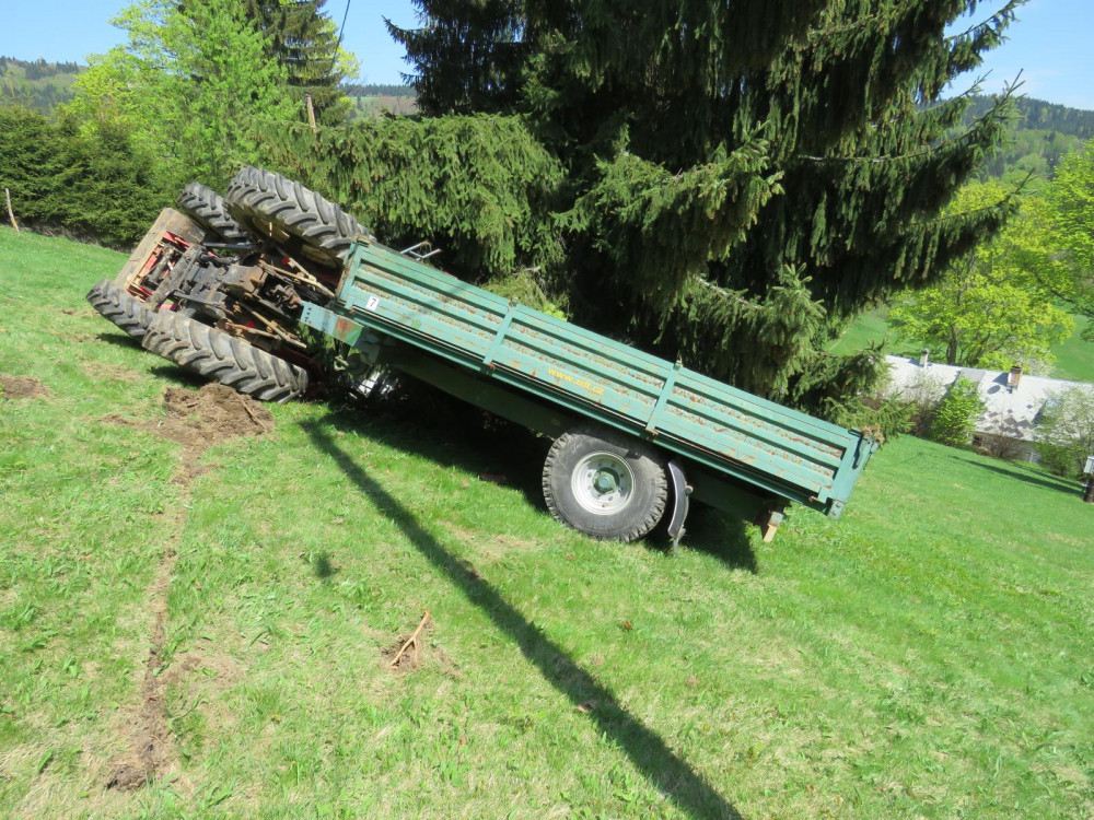 Opilý traktorista otočil svůj pracovní stroj přes střechu. Z nehody vyvázl s lehkým zraněním