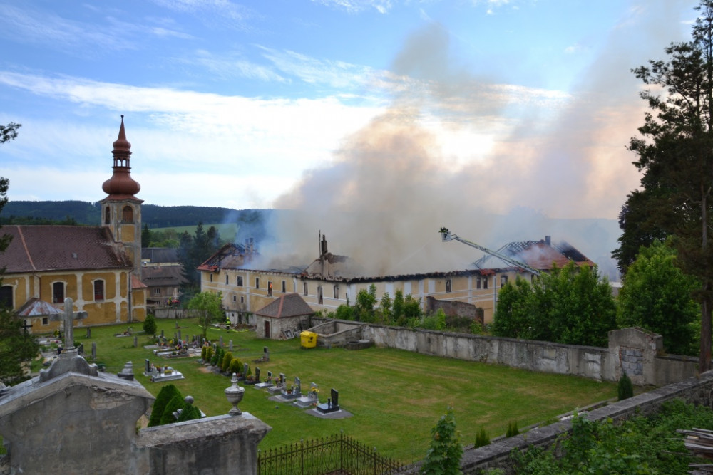 Požár v Jindřichovicích: Střecha se propadla, hasiči vozí štěpku za obec