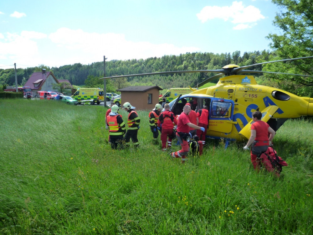 Motorkář předjížděl kolonu, do cesty mu vjelo volvo. K nehodě letěl vrtulník