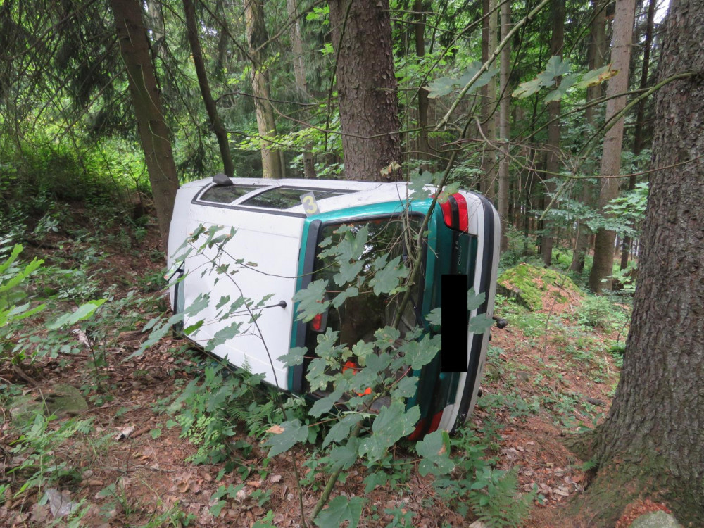 FOTO: Řidička s felicií vjela do lesa a převrátila se. Vyvázla s lehkým zraněním