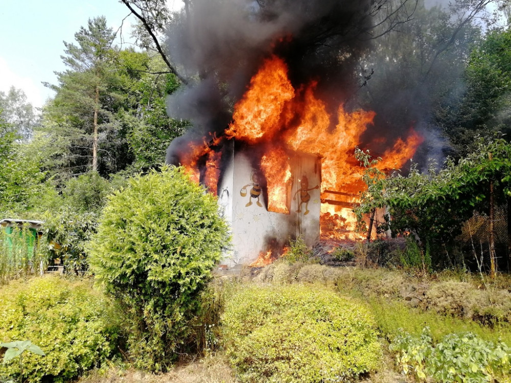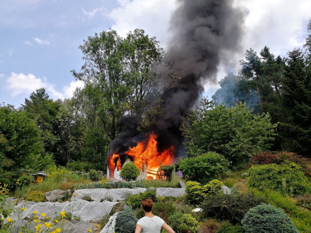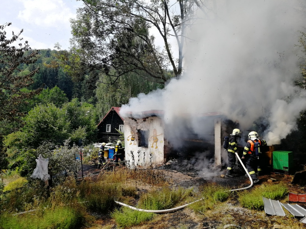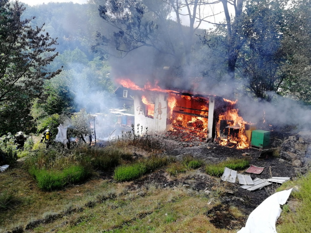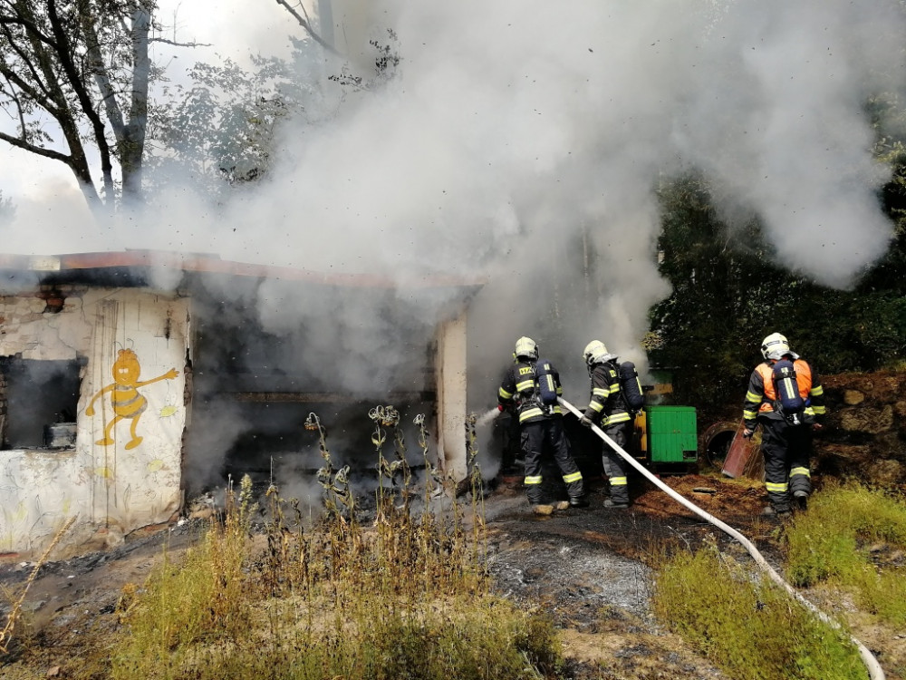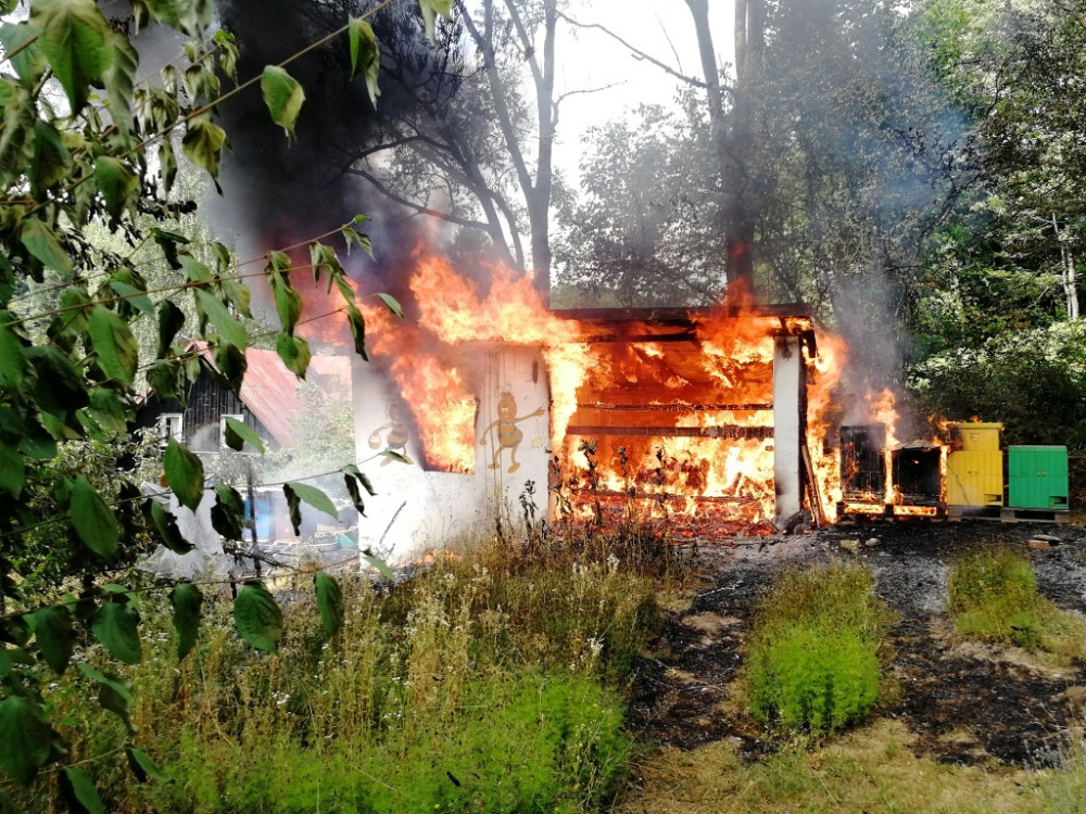 FOTO: Požár včelína likvidovaly tři jednotky hasičů. Oheň se šířil do lesa