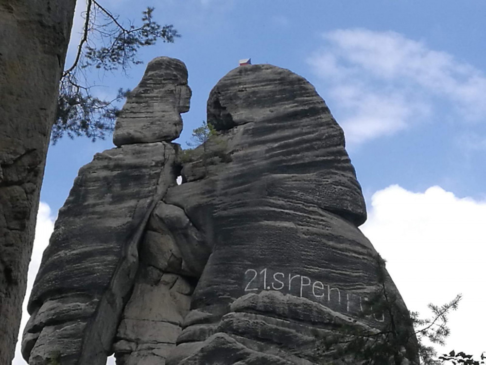 Na skalním útvaru "Milenci" v Adršpašských skalách se objevil nápis
