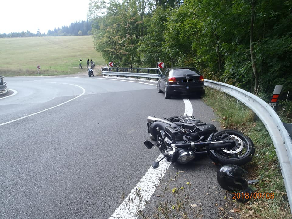FOTO: Na Albrechťáku se srazilo auto s motorkou. Její řidič skončil v nemocnici