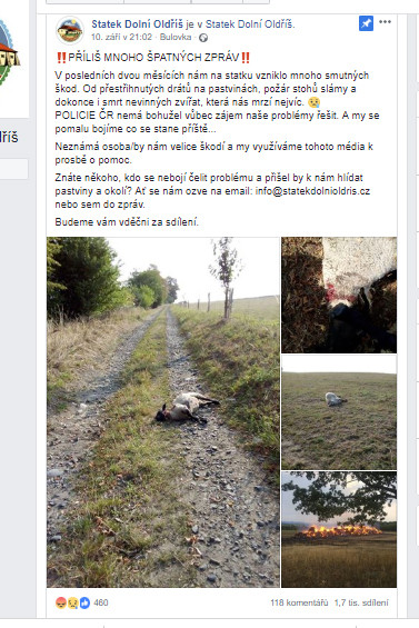 Zabité ovce, zapálená sláma a nečinnost policie, stěžuje si majitel statku v Dolní Oldříši