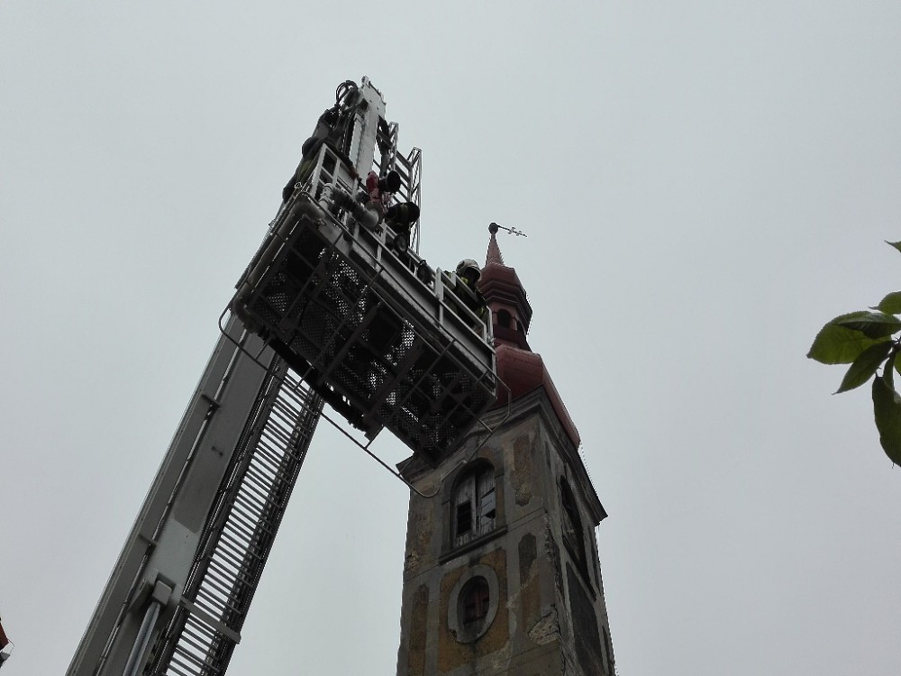 Hasiči museli kříž z věže kostela sundat.