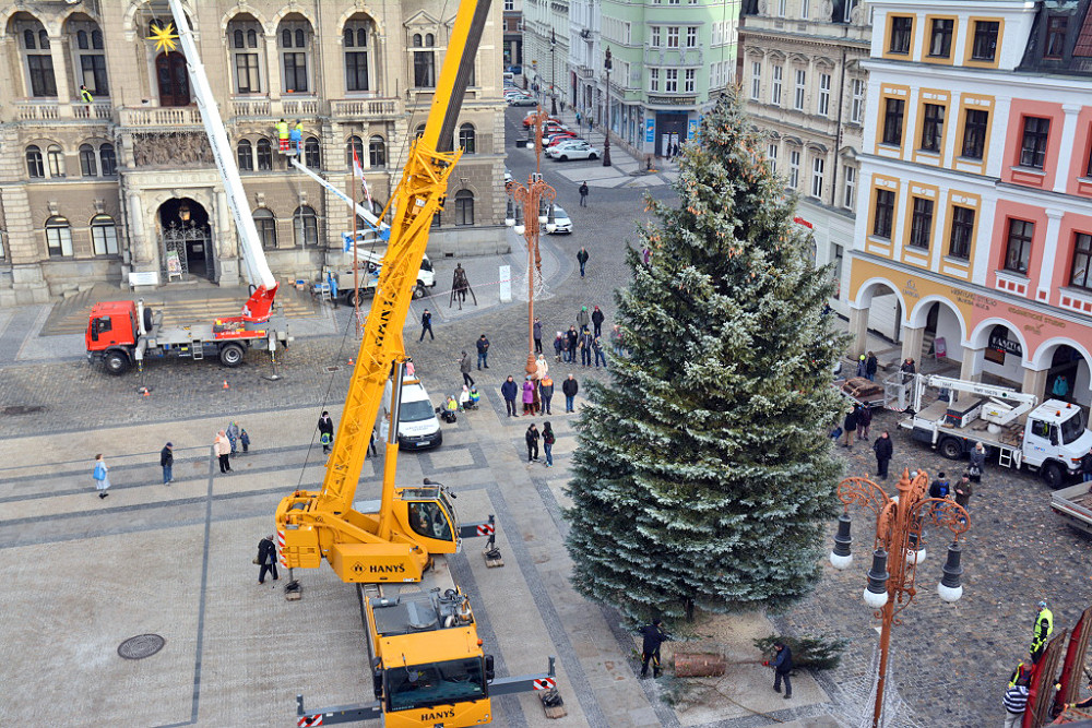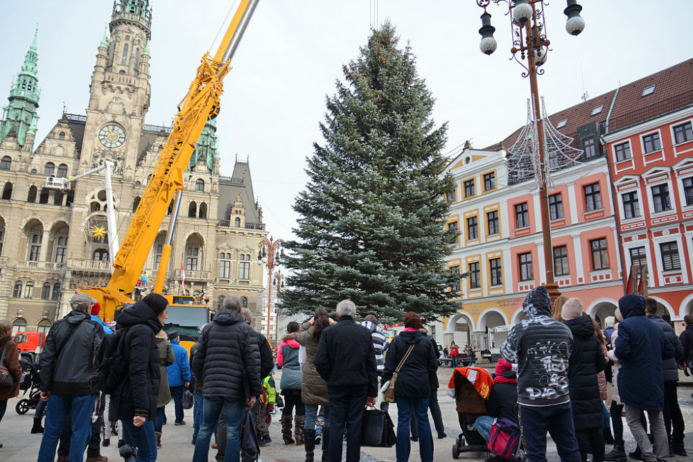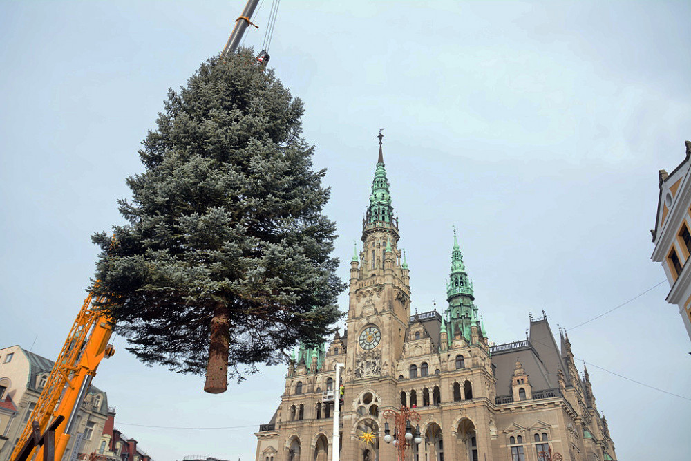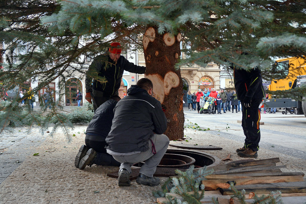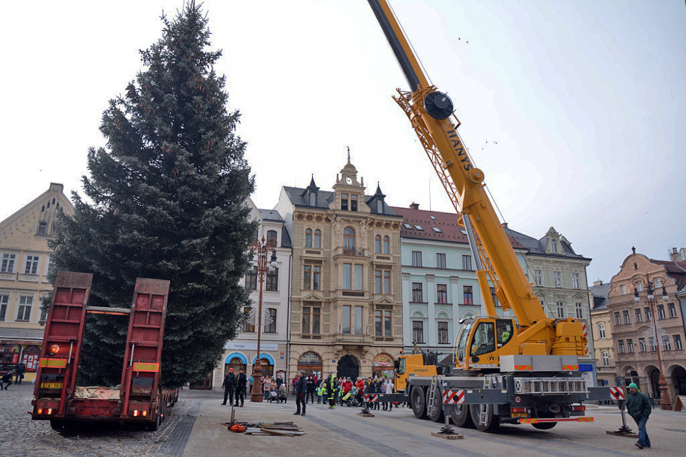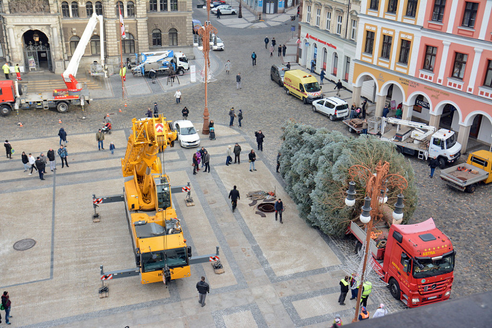 FOTO, VIDEO: Na náměstí už stojí vánoční smrk. Poprvé se rozsvítí v neděli