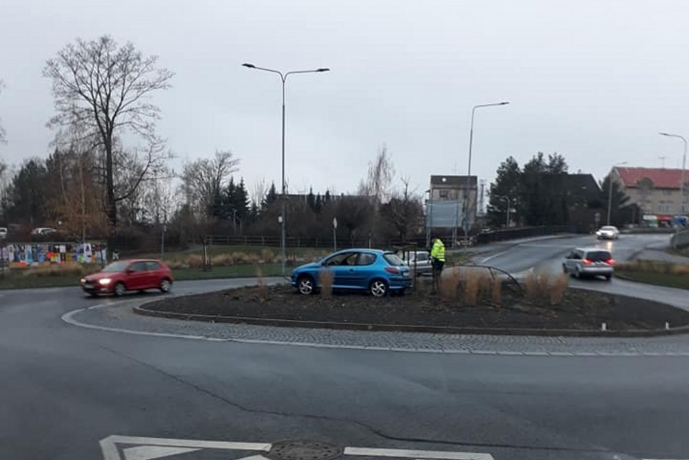 Řidička s autem vjela na ostrůvek uprostřed kruháče. Udělalo se jí nevolno